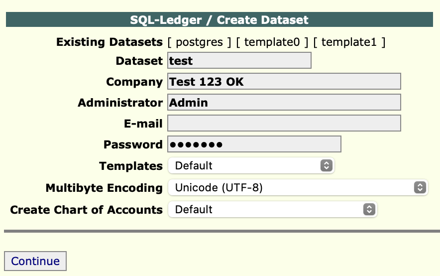 Dari internet browser (Chrome, Firefax, Safari atau Edge) hubungkan ke server. Dalam contoh ini menggunakan --> https://192.168.64.9/sql-ledger/admin.pl