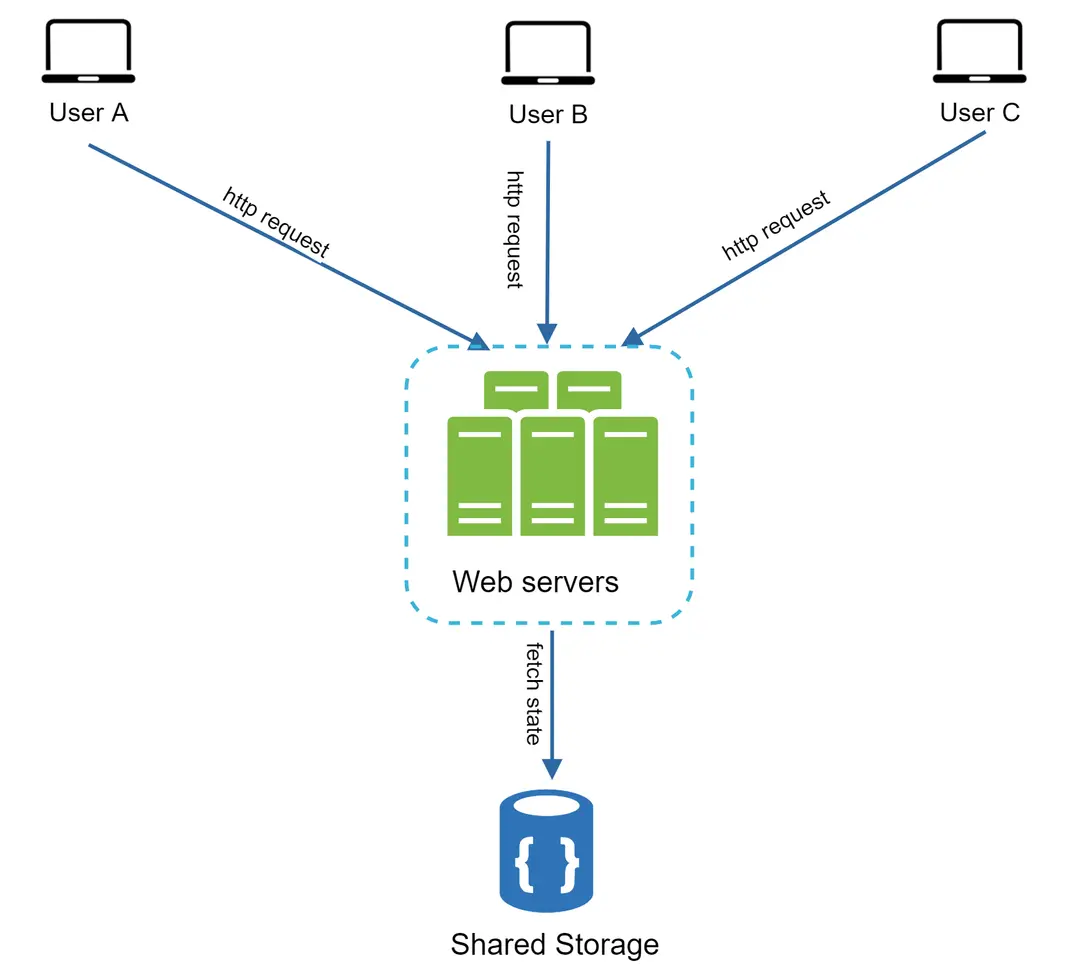 Dalam arsitektur stateless ini, permintaan HTTP dari pengguna dapat dikirim ke server web mana pun, yang kemudian mengambil data status dari penyimpanan data bersama. Data status disimpan di penyimpanan data bersama dan tidak diakses oleh server web. Sistem stateless lebih sederhana, lebih tangguh, dan skalabel.