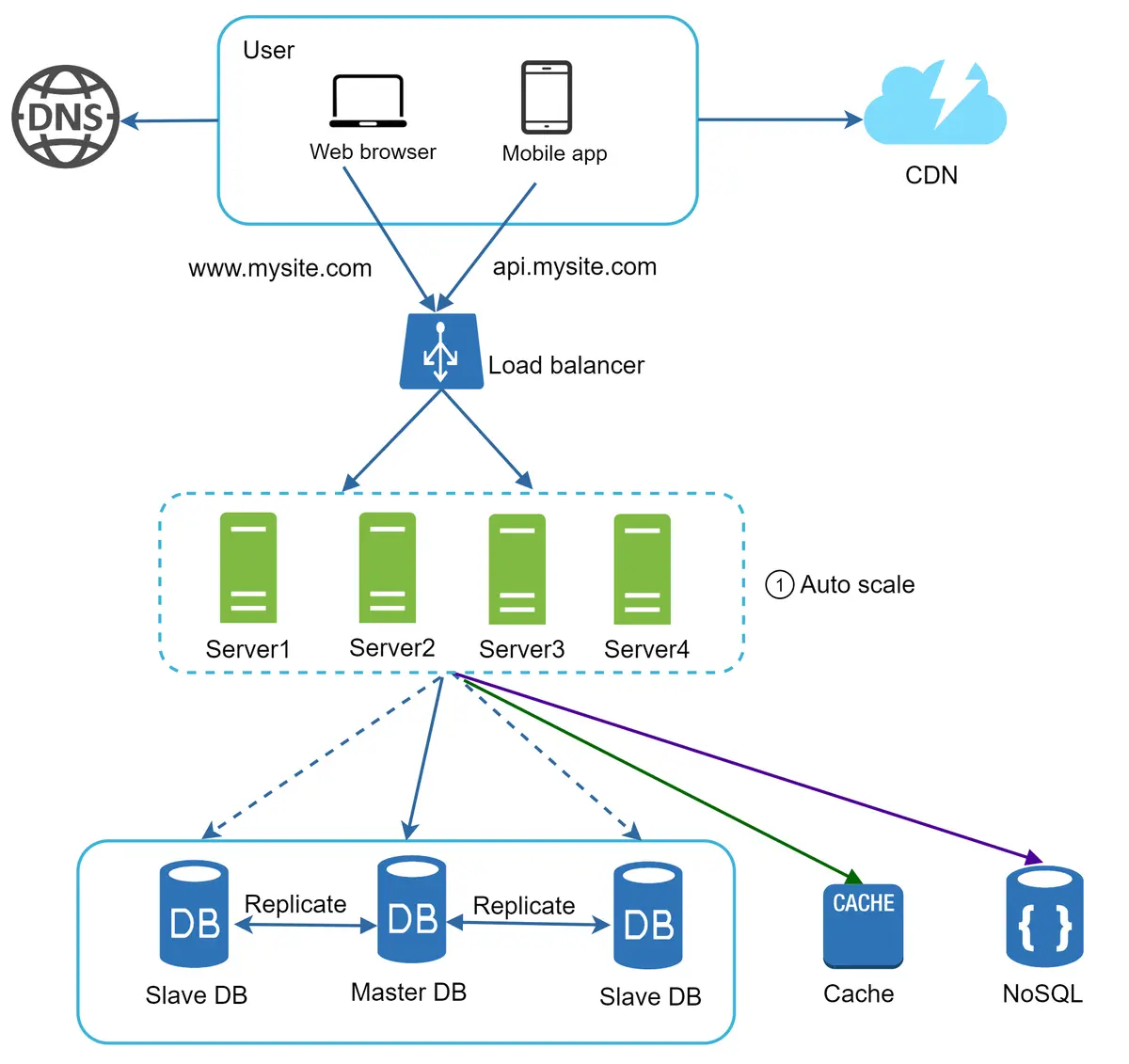 Perjalanan seribu mil dimulai dengan satu langkah, dan membangun sistem yang kompleks pun demikian. Untuk memulai dengan sesuatu yang sederhana, semuanya berjalan pada satu server. Gambar 1 menunjukkan ilustrasi pengaturan server tunggal di mana semuanya berjalan pada satu server: aplikasi web, basis data, cache, dll.