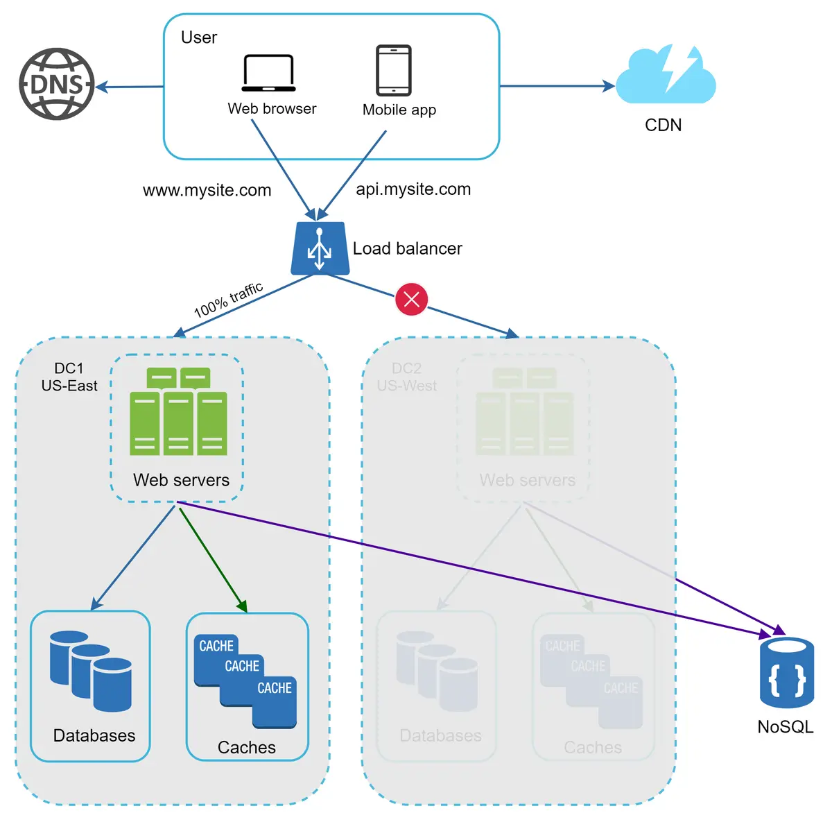 Pengalihan lalu lintas: Diperlukan alat yang efektif untuk mengarahkan lalu lintas ke pusat data yang tepat. GeoDNS dapat digunakan untuk mengarahkan lalu lintas ke pusat data terdekat, tergantung lokasi pengguna.